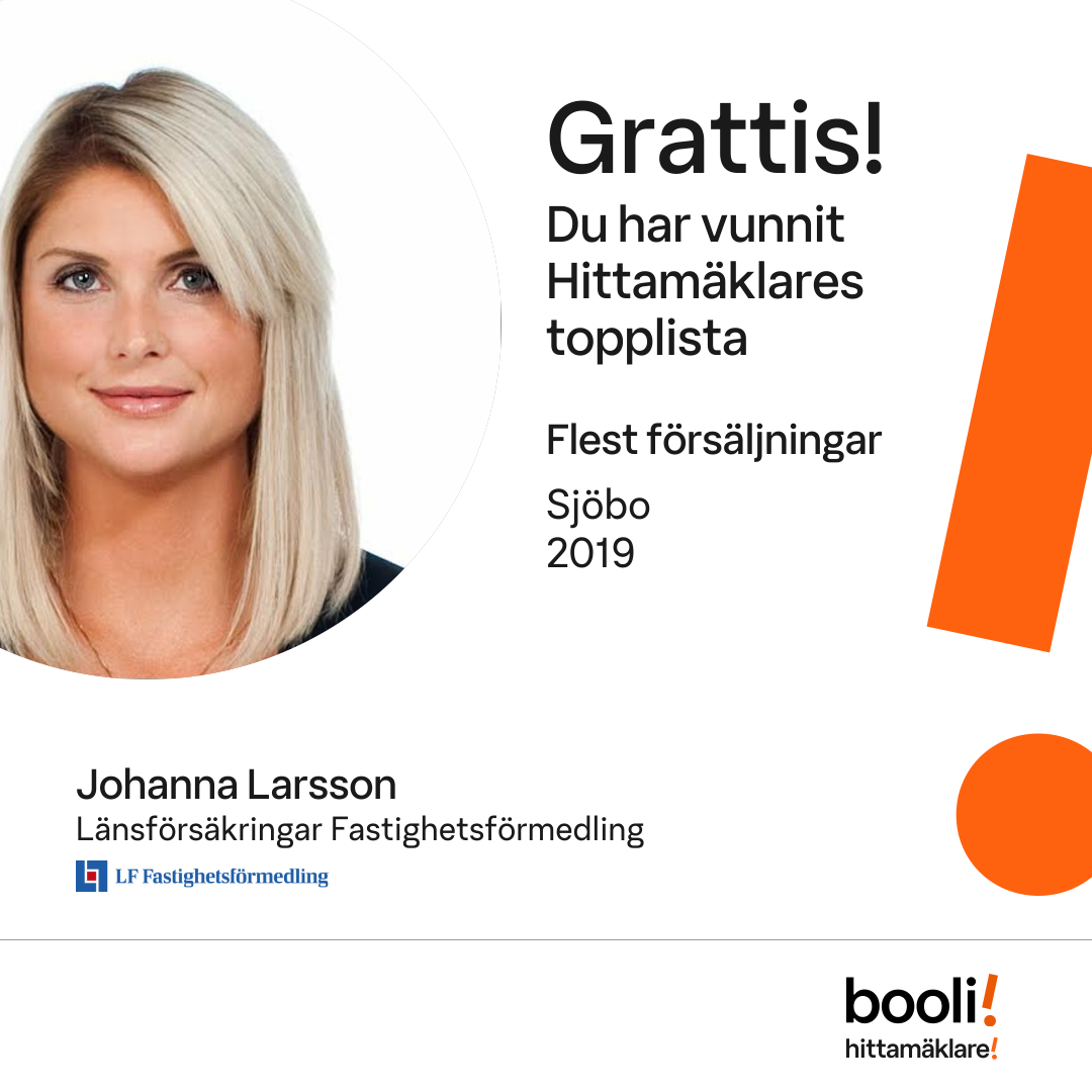 Statistik för publicerade bostäder, försäljningar och omdömen baseras på data från Booli och Hittamäklare. Statistiken för försäljningar avser inrapporterade och verifierade slutpriser från mäklare eller av Booli inhämtade och verifierade slutpriser. Statistiken för publicerade bostäder baseras på information som publicerats på Booli.se. Statistik för omdömen och rekommendationer baseras på omdömen från säljare som lämnats via Booli och Hittamäklare.