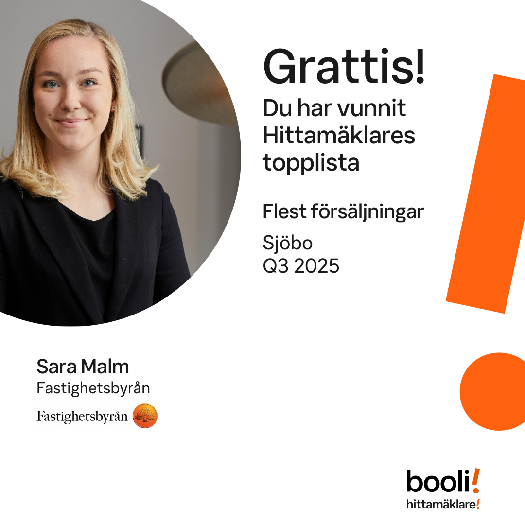 Statistik för publicerade bostäder, försäljningar och omdömen baseras på data från Booli och Hittamäklare. Statistiken för försäljningar avser inrapporterade och verifierade slutpriser från mäklare eller av Booli inhämtade och verifierade slutpriser. Statistiken för publicerade bostäder baseras på information som publicerats på Booli.se. Statistik för omdömen och rekommendationer baseras på omdömen från säljare som lämnats via Booli och Hittamäklare.