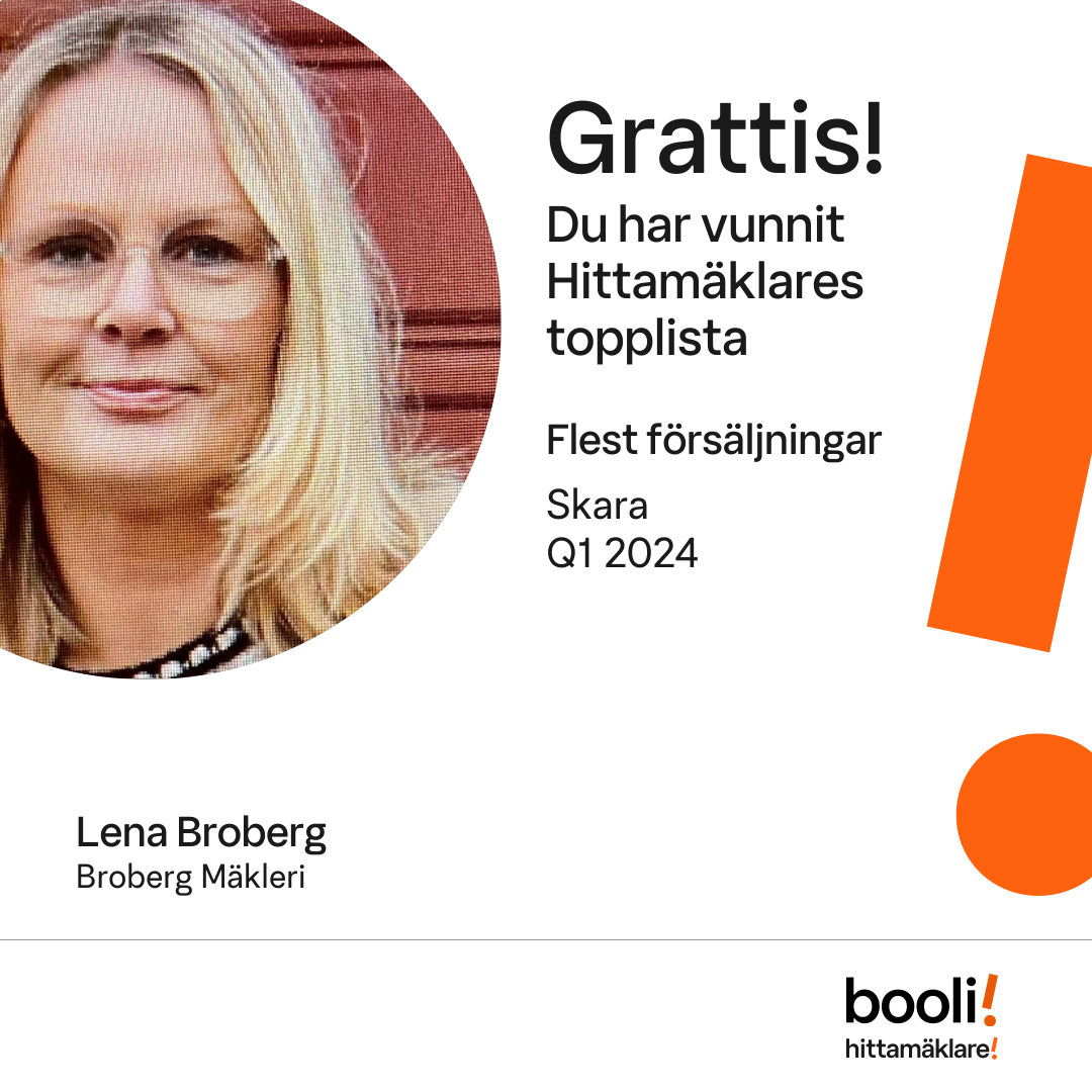 Statistik för publicerade bostäder, försäljningar och omdömen baseras på data från Booli och Hittamäklare. Statistiken för försäljningar avser inrapporterade och verifierade slutpriser från mäklare eller av Booli inhämtade och verifierade slutpriser. Statistiken för publicerade bostäder baseras på information som publicerats på Booli.se. Statistik för omdömen och rekommendationer baseras på omdömen från säljare som lämnats via Booli och Hittamäklare.