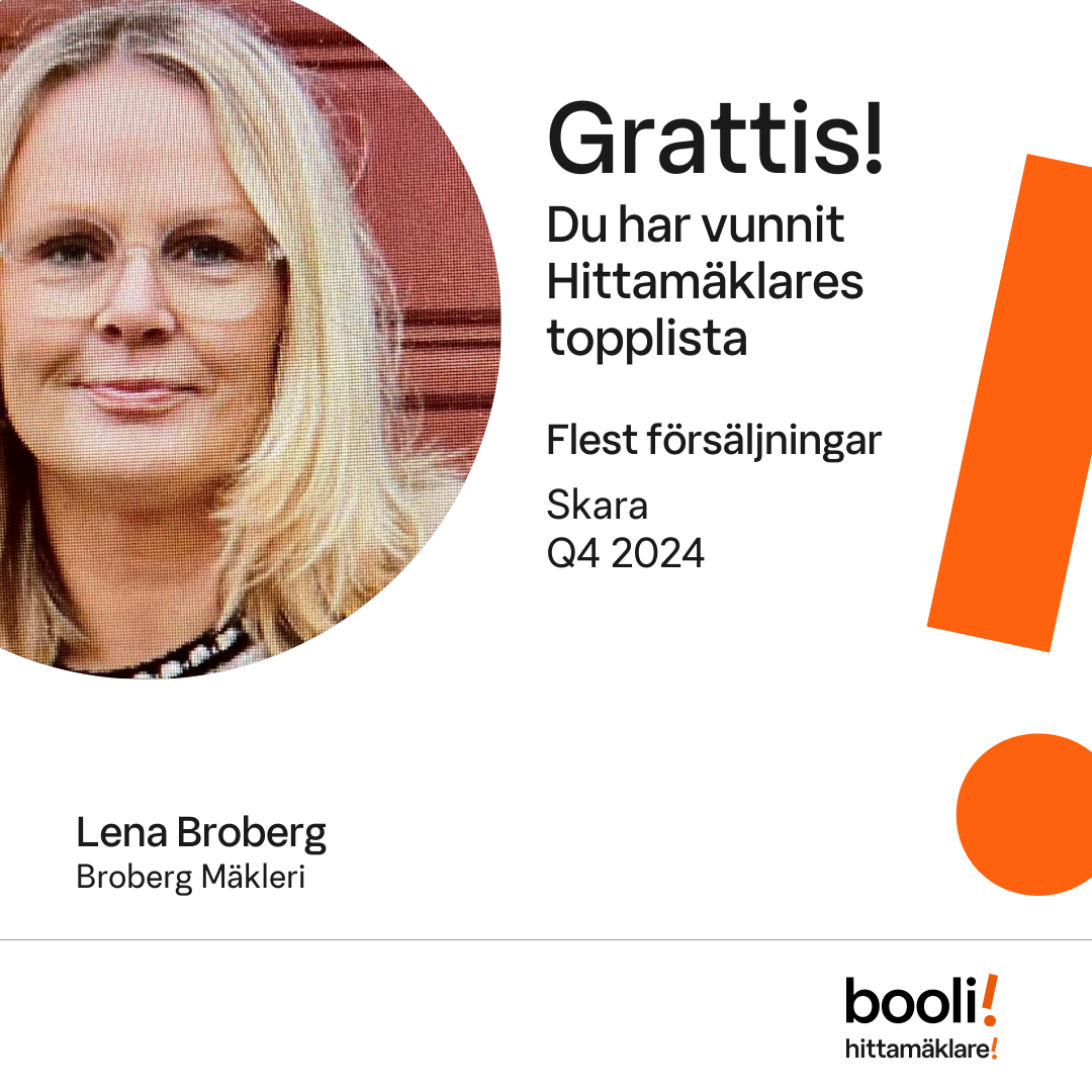 Statistik för publicerade bostäder, försäljningar och omdömen baseras på data från Booli och Hittamäklare. Statistiken för försäljningar avser inrapporterade och verifierade slutpriser från mäklare eller av Booli inhämtade och verifierade slutpriser. Statistiken för publicerade bostäder baseras på information som publicerats på Booli.se. Statistik för omdömen och rekommendationer baseras på omdömen från säljare som lämnats via Booli och Hittamäklare.