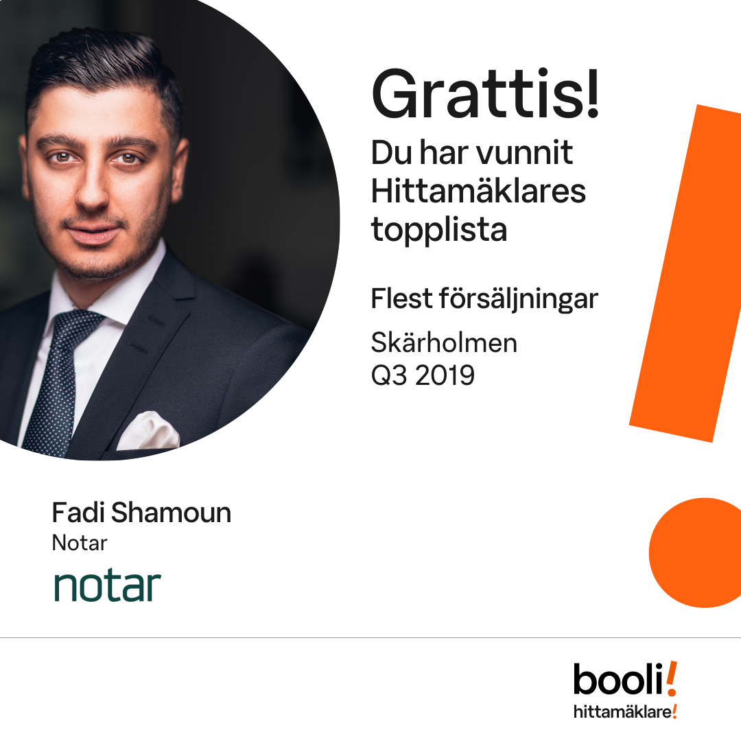 Statistik för publicerade bostäder, försäljningar och omdömen baseras på data från Booli och Hittamäklare. Statistiken för försäljningar avser inrapporterade och verifierade slutpriser från mäklare eller av Booli inhämtade och verifierade slutpriser. Statistiken för publicerade bostäder baseras på information som publicerats på Booli.se. Statistik för omdömen och rekommendationer baseras på omdömen från säljare som lämnats via Booli och Hittamäklare.