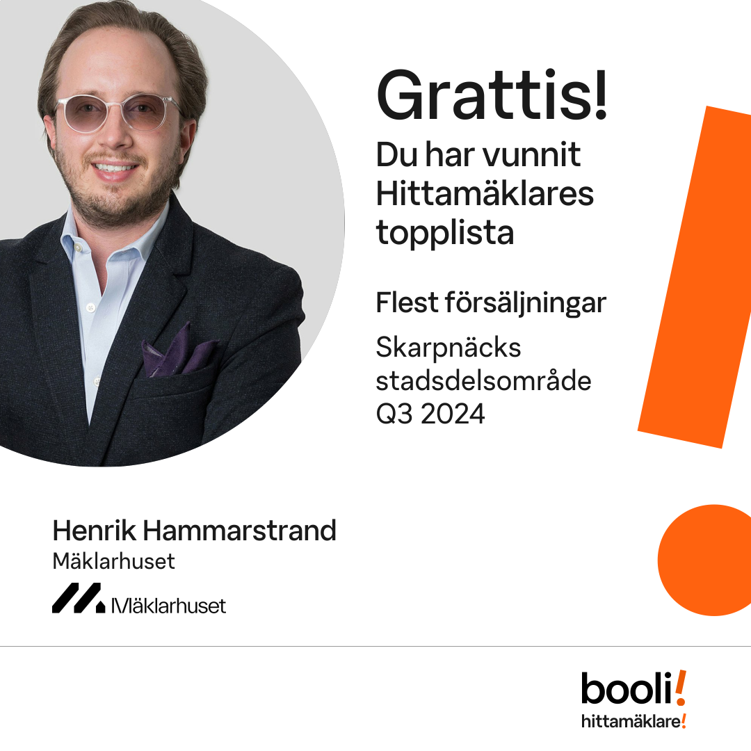 Statistik för publicerade bostäder, försäljningar och omdömen baseras på data från Booli och Hittamäklare. Statistiken för försäljningar avser inrapporterade och verifierade slutpriser från mäklare eller av Booli inhämtade och verifierade slutpriser. Statistiken för publicerade bostäder baseras på information som publicerats på Booli.se. Statistik för omdömen och rekommendationer baseras på omdömen från säljare som lämnats via Booli och Hittamäklare.