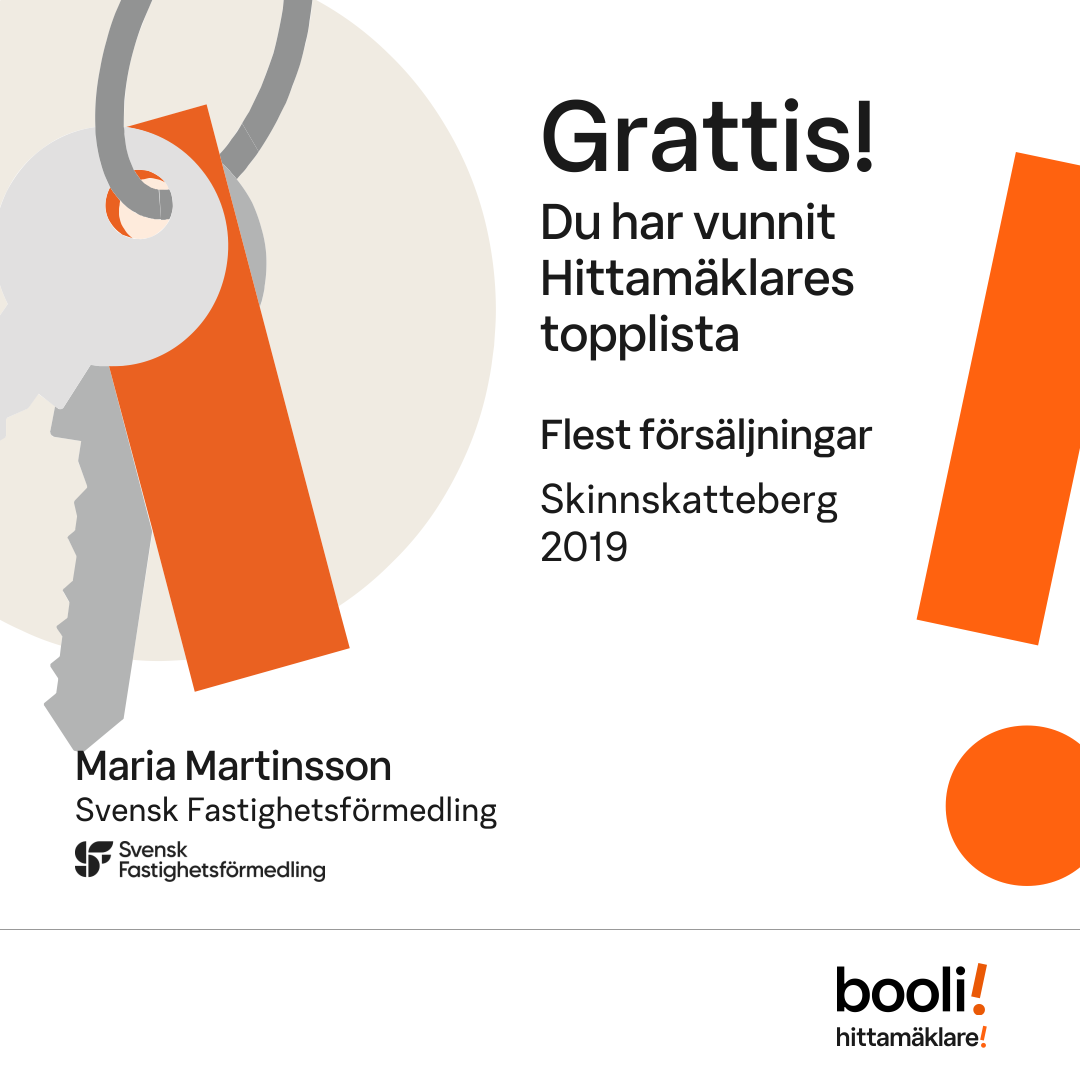 Statistik för publicerade bostäder, försäljningar och omdömen baseras på data från Booli och Hittamäklare. Statistiken för försäljningar avser inrapporterade och verifierade slutpriser från mäklare eller av Booli inhämtade och verifierade slutpriser. Statistiken för publicerade bostäder baseras på information som publicerats på Booli.se. Statistik för omdömen och rekommendationer baseras på omdömen från säljare som lämnats via Booli och Hittamäklare.