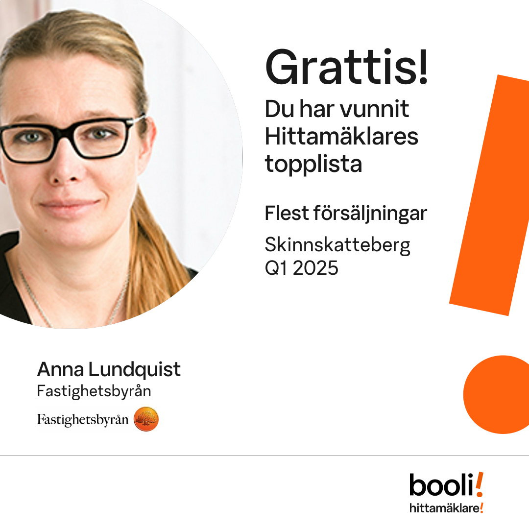 Statistik för publicerade bostäder, försäljningar och omdömen baseras på data från Booli och Hittamäklare. Statistiken för försäljningar avser inrapporterade och verifierade slutpriser från mäklare eller av Booli inhämtade och verifierade slutpriser. Statistiken för publicerade bostäder baseras på information som publicerats på Booli.se. Statistik för omdömen och rekommendationer baseras på omdömen från säljare som lämnats via Booli och Hittamäklare.