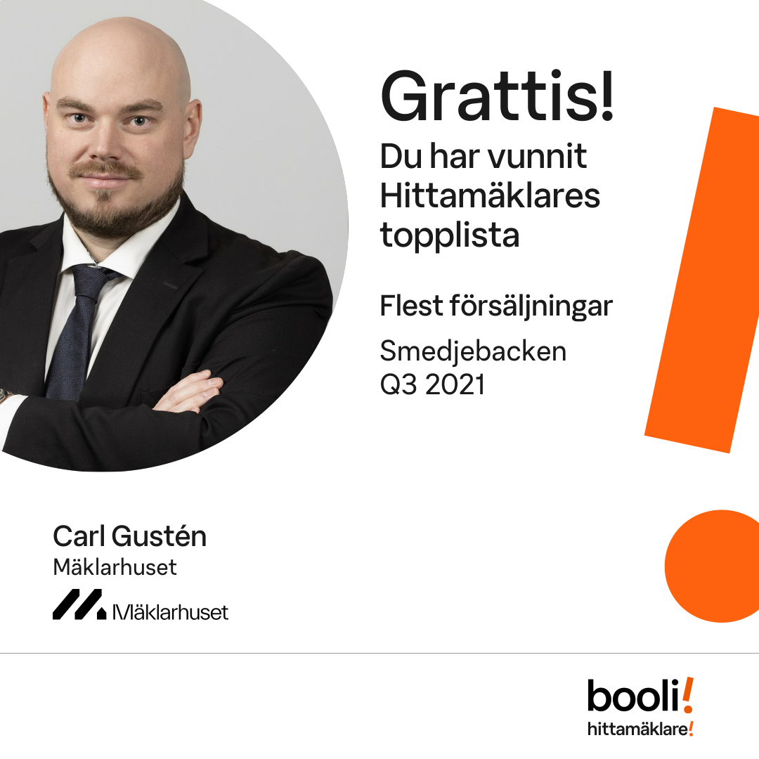 Statistik för publicerade bostäder, försäljningar och omdömen baseras på data från Booli och Hittamäklare. Statistiken för försäljningar avser inrapporterade och verifierade slutpriser från mäklare eller av Booli inhämtade och verifierade slutpriser. Statistiken för publicerade bostäder baseras på information som publicerats på Booli.se. Statistik för omdömen och rekommendationer baseras på omdömen från säljare som lämnats via Booli och Hittamäklare.