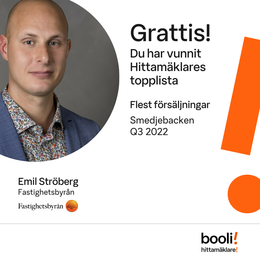Statistik för publicerade bostäder, försäljningar och omdömen baseras på data från Booli och Hittamäklare. Statistiken för försäljningar avser inrapporterade och verifierade slutpriser från mäklare eller av Booli inhämtade och verifierade slutpriser. Statistiken för publicerade bostäder baseras på information som publicerats på Booli.se. Statistik för omdömen och rekommendationer baseras på omdömen från säljare som lämnats via Booli och Hittamäklare.