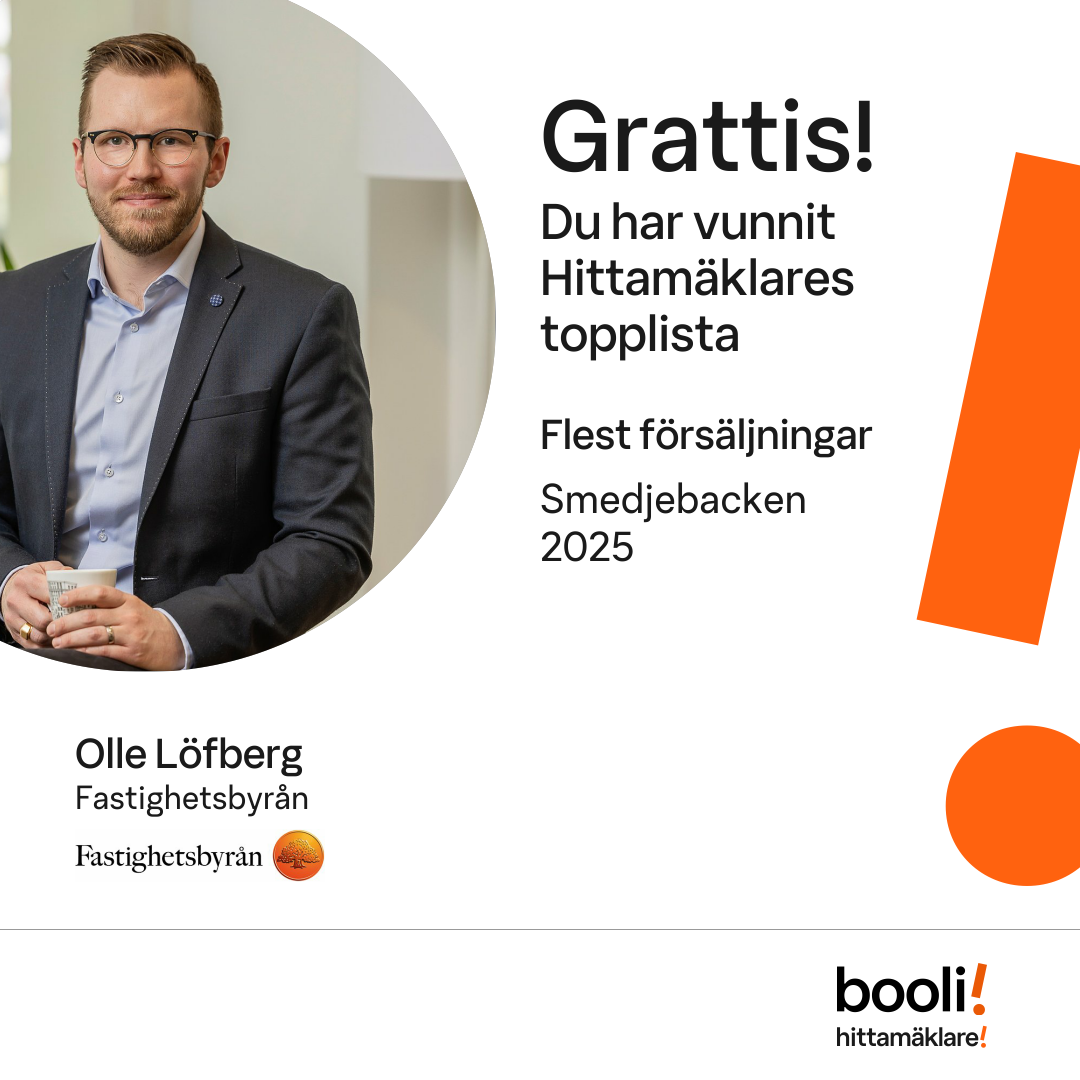 Statistik för publicerade bostäder, försäljningar och omdömen baseras på data från Booli och Hittamäklare. Statistiken för försäljningar avser inrapporterade och verifierade slutpriser från mäklare eller av Booli inhämtade och verifierade slutpriser. Statistiken för publicerade bostäder baseras på information som publicerats på Booli.se. Statistik för omdömen och rekommendationer baseras på omdömen från säljare som lämnats via Booli och Hittamäklare.
