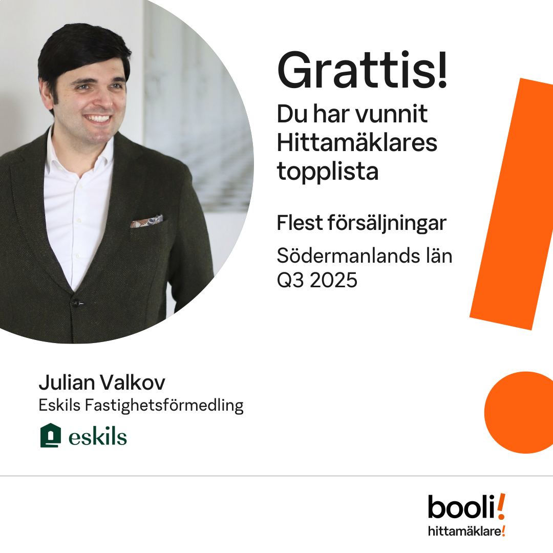 Statistik för publicerade bostäder, försäljningar och omdömen baseras på data från Booli och Hittamäklare. Statistiken för försäljningar avser inrapporterade och verifierade slutpriser från mäklare eller av Booli inhämtade och verifierade slutpriser. Statistiken för publicerade bostäder baseras på information som publicerats på Booli.se. Statistik för omdömen och rekommendationer baseras på omdömen från säljare som lämnats via Booli och Hittamäklare.