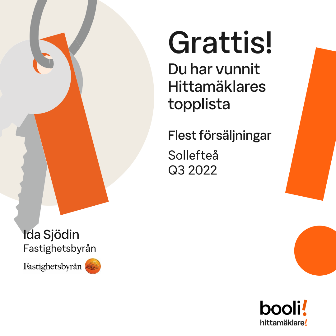 Statistik för publicerade bostäder, försäljningar och omdömen baseras på data från Booli och Hittamäklare. Statistiken för försäljningar avser inrapporterade och verifierade slutpriser från mäklare eller av Booli inhämtade och verifierade slutpriser. Statistiken för publicerade bostäder baseras på information som publicerats på Booli.se. Statistik för omdömen och rekommendationer baseras på omdömen från säljare som lämnats via Booli och Hittamäklare.