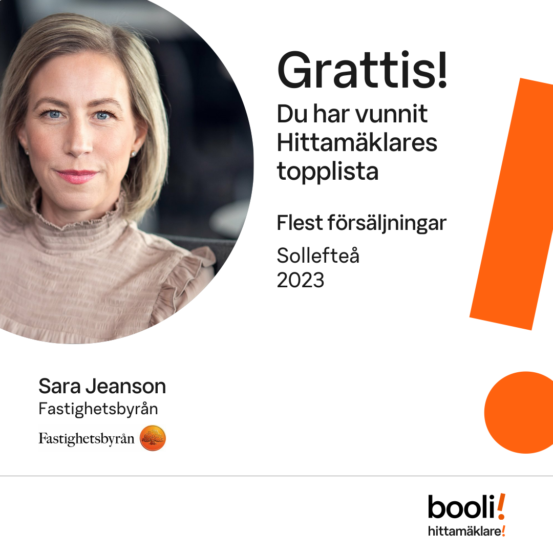 Statistik för publicerade bostäder, försäljningar och omdömen baseras på data från Booli och Hittamäklare. Statistiken för försäljningar avser inrapporterade och verifierade slutpriser från mäklare eller av Booli inhämtade och verifierade slutpriser. Statistiken för publicerade bostäder baseras på information som publicerats på Booli.se. Statistik för omdömen och rekommendationer baseras på omdömen från säljare som lämnats via Booli och Hittamäklare.