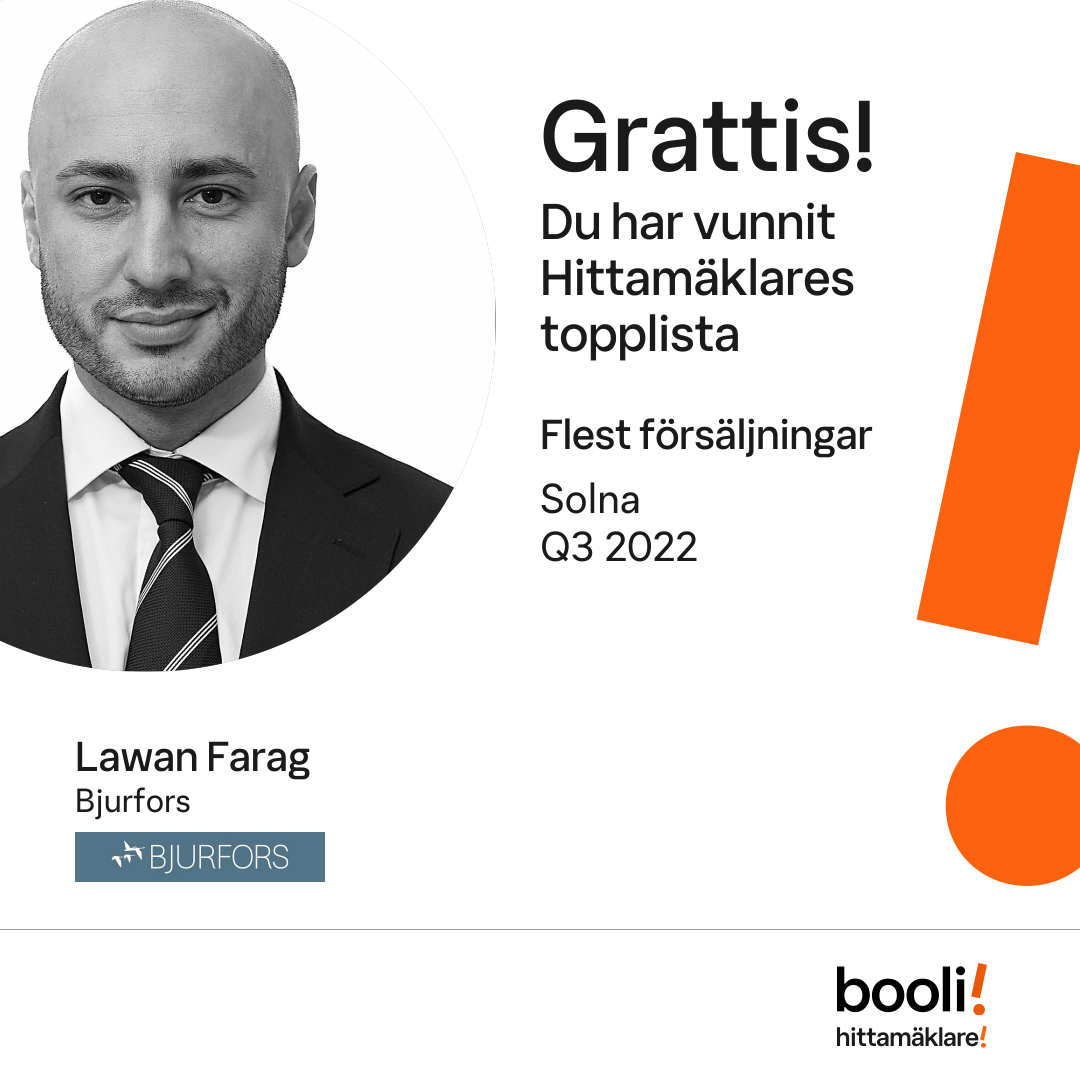 Statistik för publicerade bostäder, försäljningar och omdömen baseras på data från Booli och Hittamäklare. Statistiken för försäljningar avser inrapporterade och verifierade slutpriser från mäklare eller av Booli inhämtade och verifierade slutpriser. Statistiken för publicerade bostäder baseras på information som publicerats på Booli.se. Statistik för omdömen och rekommendationer baseras på omdömen från säljare som lämnats via Booli och Hittamäklare.