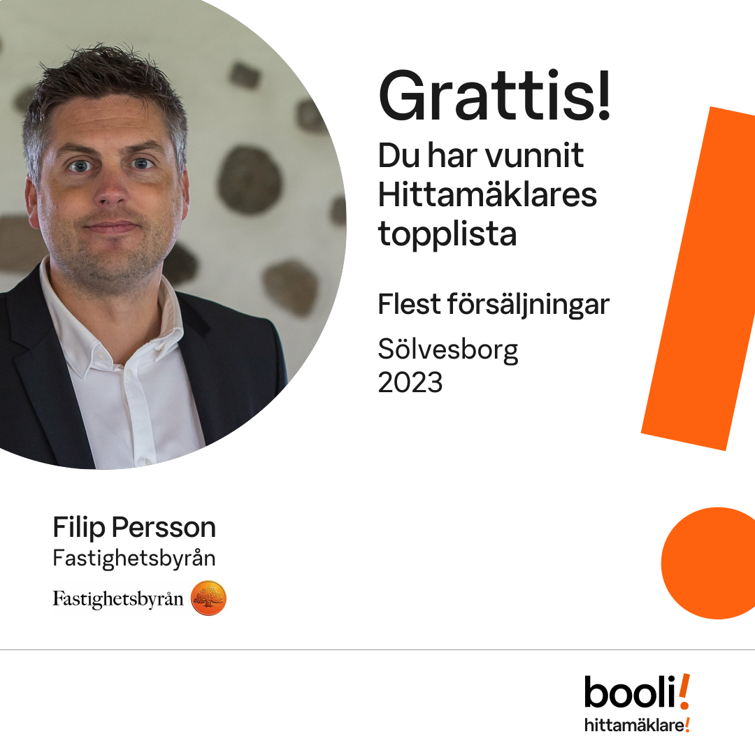Statistik för publicerade bostäder, försäljningar och omdömen baseras på data från Booli och Hittamäklare. Statistiken för försäljningar avser inrapporterade och verifierade slutpriser från mäklare eller av Booli inhämtade och verifierade slutpriser. Statistiken för publicerade bostäder baseras på information som publicerats på Booli.se. Statistik för omdömen och rekommendationer baseras på omdömen från säljare som lämnats via Booli och Hittamäklare.