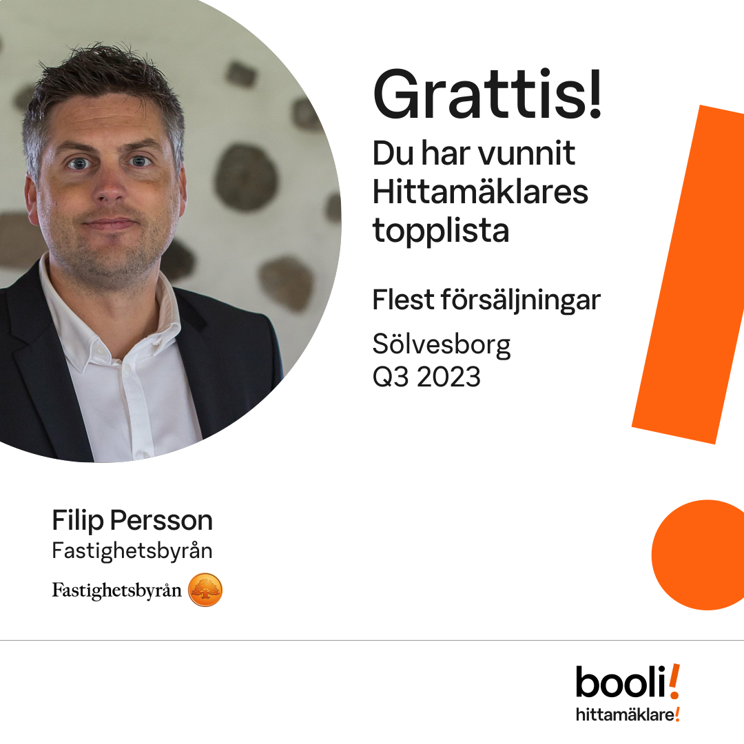 Statistik för publicerade bostäder, försäljningar och omdömen baseras på data från Booli. Statistiken för försäljningar avser inrapporterade och verifierade slutpriser från mäklare eller av Booli inhämtade och verifierade slutpriser. Statistiken för publicerade bostäder baseras på information som publicerats på Booli.se. Statistik för omdömen och rekommendationer baseras på omdömen från säljare som lämnats via Booli.