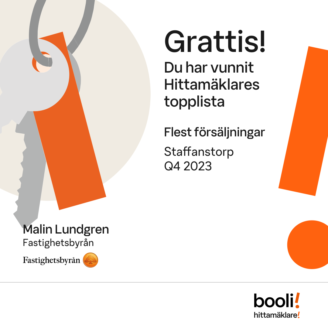 Statistik för publicerade bostäder, försäljningar och omdömen baseras på data från Booli och Hittamäklare. Statistiken för försäljningar avser inrapporterade och verifierade slutpriser från mäklare eller av Booli inhämtade och verifierade slutpriser. Statistiken för publicerade bostäder baseras på information som publicerats på Booli.se. Statistik för omdömen och rekommendationer baseras på omdömen från säljare som lämnats via Booli och Hittamäklare.
