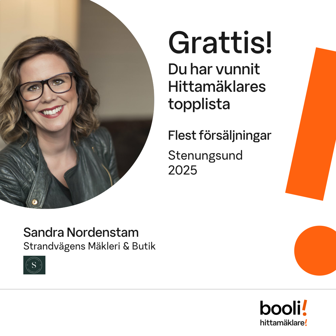Statistik för publicerade bostäder, försäljningar och omdömen baseras på data från Booli och Hittamäklare. Statistiken för försäljningar avser inrapporterade och verifierade slutpriser från mäklare eller av Booli inhämtade och verifierade slutpriser. Statistiken för publicerade bostäder baseras på information som publicerats på Booli.se. Statistik för omdömen och rekommendationer baseras på omdömen från säljare som lämnats via Booli och Hittamäklare.