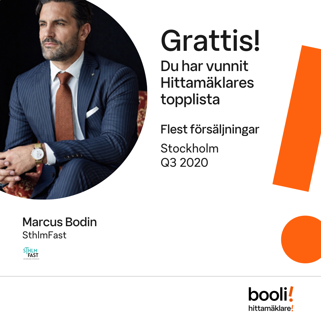 Statistik för publicerade bostäder, försäljningar och omdömen baseras på data från Booli och Hittamäklare. Statistiken för försäljningar avser inrapporterade och verifierade slutpriser från mäklare eller av Booli inhämtade och verifierade slutpriser. Statistiken för publicerade bostäder baseras på information som publicerats på Booli.se. Statistik för omdömen och rekommendationer baseras på omdömen från säljare som lämnats via Booli och Hittamäklare.