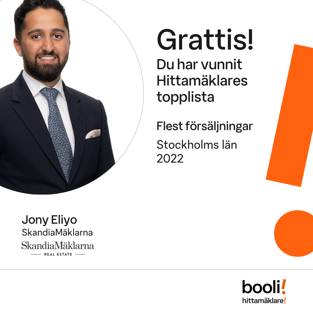 Statistik för publicerade bostäder, försäljningar och omdömen baseras på data från Booli och Hittamäklare. Statistiken för försäljningar avser inrapporterade och verifierade slutpriser från mäklare eller av Booli inhämtade och verifierade slutpriser. Statistiken för publicerade bostäder baseras på information som publicerats på Booli.se. Statistik för omdömen och rekommendationer baseras på omdömen från säljare som lämnats via Booli och Hittamäklare.