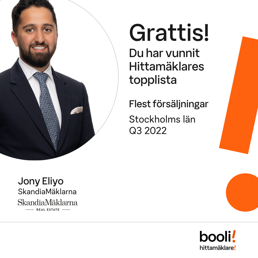 Statistik för publicerade bostäder, försäljningar och omdömen baseras på data från Booli och Hittamäklare. Statistiken för försäljningar avser inrapporterade och verifierade slutpriser från mäklare eller av Booli inhämtade och verifierade slutpriser. Statistiken för publicerade bostäder baseras på information som publicerats på Booli.se. Statistik för omdömen och rekommendationer baseras på omdömen från säljare som lämnats via Booli och Hittamäklare.
