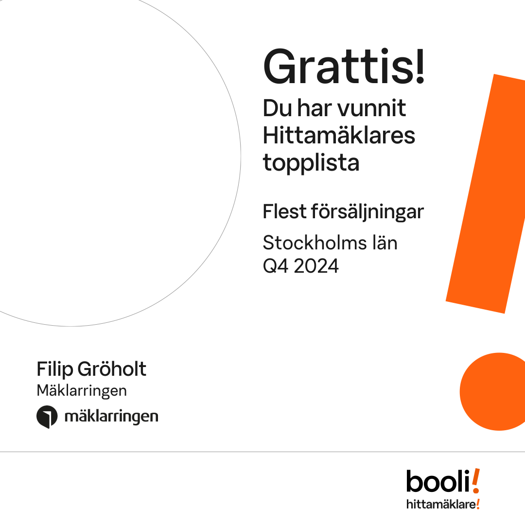 Statistik för publicerade bostäder, försäljningar och omdömen baseras på data från Booli och Hittamäklare. Statistiken för försäljningar avser inrapporterade och verifierade slutpriser från mäklare eller av Booli inhämtade och verifierade slutpriser. Statistiken för publicerade bostäder baseras på information som publicerats på Booli.se. Statistik för omdömen och rekommendationer baseras på omdömen från säljare som lämnats via Booli och Hittamäklare.
