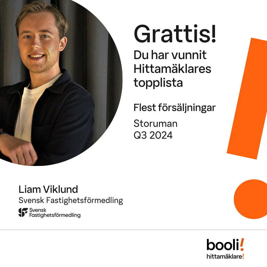 Statistik för publicerade bostäder, försäljningar och omdömen baseras på data från Booli och Hittamäklare. Statistiken för försäljningar avser inrapporterade och verifierade slutpriser från mäklare eller av Booli inhämtade och verifierade slutpriser. Statistiken för publicerade bostäder baseras på information som publicerats på Booli.se. Statistik för omdömen och rekommendationer baseras på omdömen från säljare som lämnats via Booli och Hittamäklare.