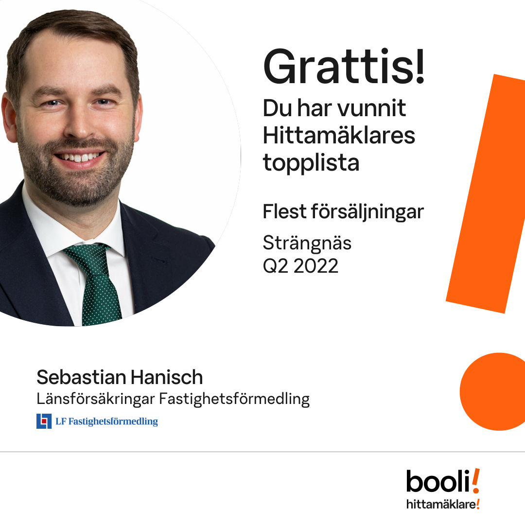 Statistik för publicerade bostäder, försäljningar och omdömen baseras på data från Booli och Hittamäklare. Statistiken för försäljningar avser inrapporterade och verifierade slutpriser från mäklare eller av Booli inhämtade och verifierade slutpriser. Statistiken för publicerade bostäder baseras på information som publicerats på Booli.se. Statistik för omdömen och rekommendationer baseras på omdömen från säljare som lämnats via Booli och Hittamäklare.
