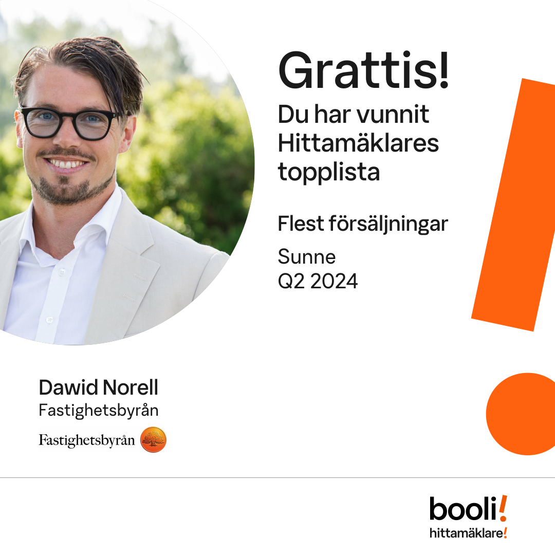 Statistik för publicerade bostäder, försäljningar och omdömen baseras på data från Booli och Hittamäklare. Statistiken för försäljningar avser inrapporterade och verifierade slutpriser från mäklare eller av Booli inhämtade och verifierade slutpriser. Statistiken för publicerade bostäder baseras på information som publicerats på Booli.se. Statistik för omdömen och rekommendationer baseras på omdömen från säljare som lämnats via Booli och Hittamäklare.