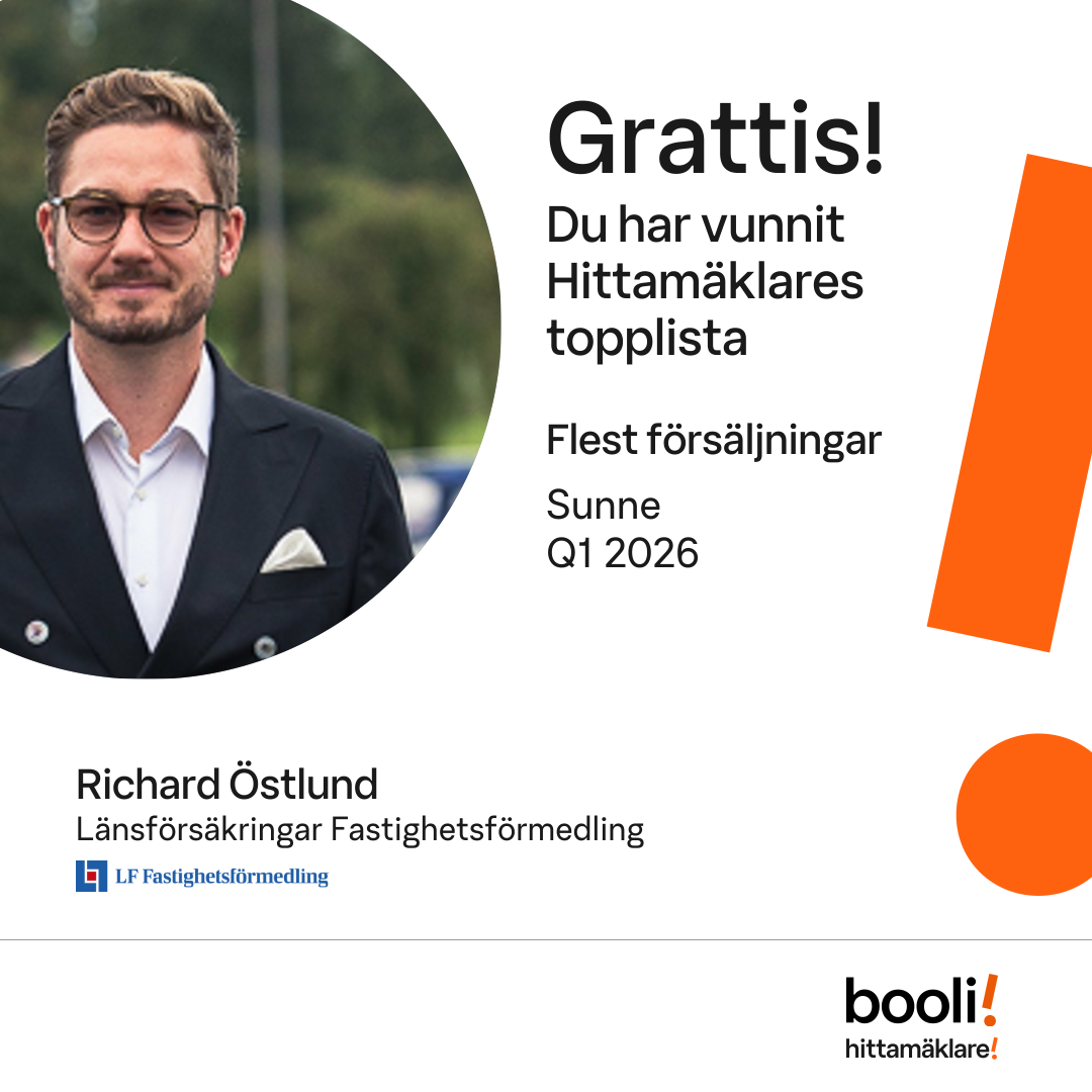Statistik för publicerade bostäder, försäljningar och omdömen baseras på data från Booli. Statistiken för försäljningar avser inrapporterade och verifierade slutpriser från mäklare eller av Booli inhämtade och verifierade slutpriser. Statistiken för publicerade bostäder baseras på information som publicerats på Booli.se. Statistik för omdömen och rekommendationer baseras på omdömen från säljare som lämnats via Booli.