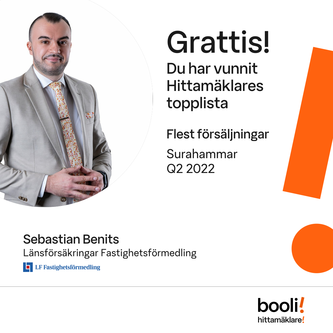Statistik för publicerade bostäder, försäljningar och omdömen baseras på data från Booli och Hittamäklare. Statistiken för försäljningar avser inrapporterade och verifierade slutpriser från mäklare eller av Booli inhämtade och verifierade slutpriser. Statistiken för publicerade bostäder baseras på information som publicerats på Booli.se. Statistik för omdömen och rekommendationer baseras på omdömen från säljare som lämnats via Booli och Hittamäklare.