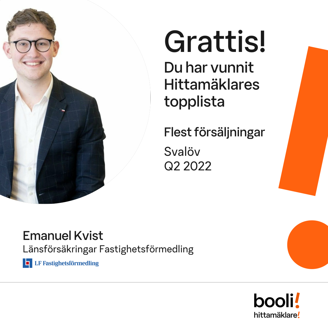 Statistik för publicerade bostäder, försäljningar och omdömen baseras på data från Booli och Hittamäklare. Statistiken för försäljningar avser inrapporterade och verifierade slutpriser från mäklare eller av Booli inhämtade och verifierade slutpriser. Statistiken för publicerade bostäder baseras på information som publicerats på Booli.se. Statistik för omdömen och rekommendationer baseras på omdömen från säljare som lämnats via Booli och Hittamäklare.