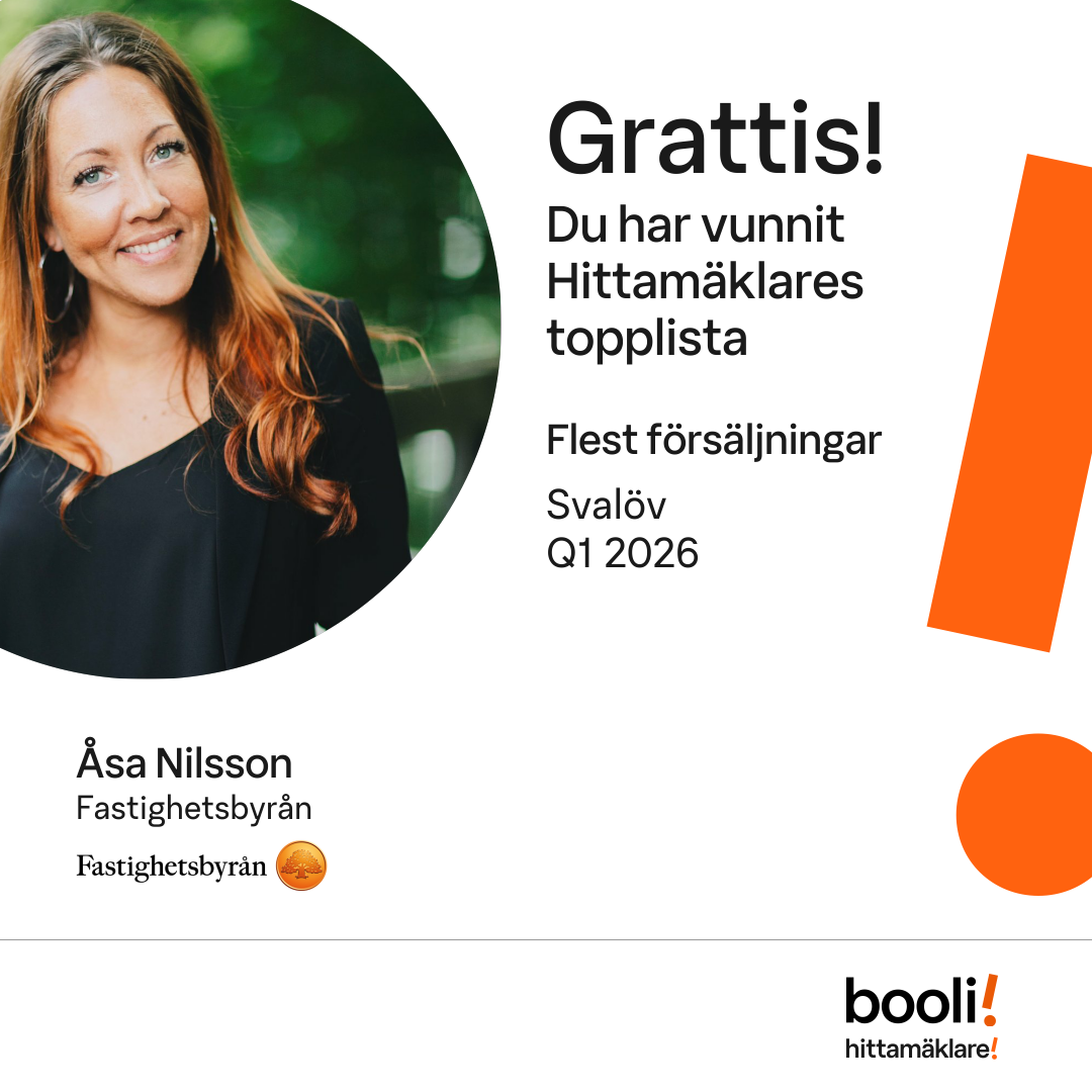 Statistik för publicerade bostäder, försäljningar och omdömen baseras på data från Booli. Statistiken för försäljningar avser inrapporterade och verifierade slutpriser från mäklare eller av Booli inhämtade och verifierade slutpriser. Statistiken för publicerade bostäder baseras på information som publicerats på Booli.se. Statistik för omdömen och rekommendationer baseras på omdömen från säljare som lämnats via Booli.