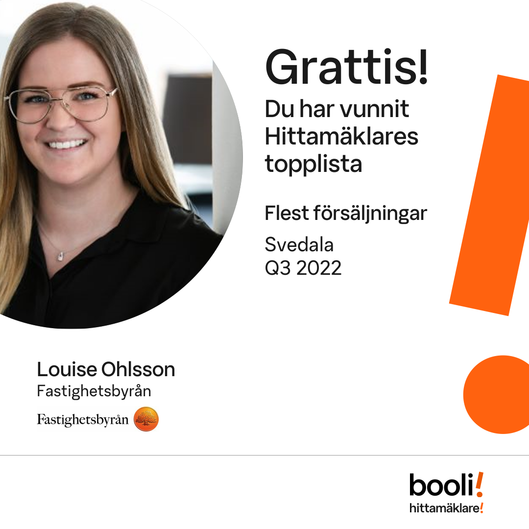 Statistik för publicerade bostäder, försäljningar och omdömen baseras på data från Booli och Hittamäklare. Statistiken för försäljningar avser inrapporterade och verifierade slutpriser från mäklare eller av Booli inhämtade och verifierade slutpriser. Statistiken för publicerade bostäder baseras på information som publicerats på Booli.se. Statistik för omdömen och rekommendationer baseras på omdömen från säljare som lämnats via Booli och Hittamäklare.