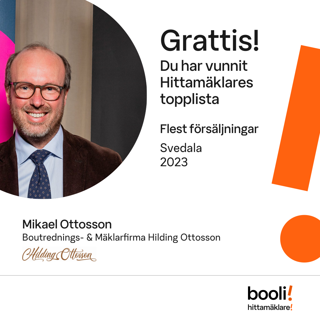 Statistik för publicerade bostäder, försäljningar och omdömen baseras på data från Booli och Hittamäklare. Statistiken för försäljningar avser inrapporterade och verifierade slutpriser från mäklare eller av Booli inhämtade och verifierade slutpriser. Statistiken för publicerade bostäder baseras på information som publicerats på Booli.se. Statistik för omdömen och rekommendationer baseras på omdömen från säljare som lämnats via Booli och Hittamäklare.