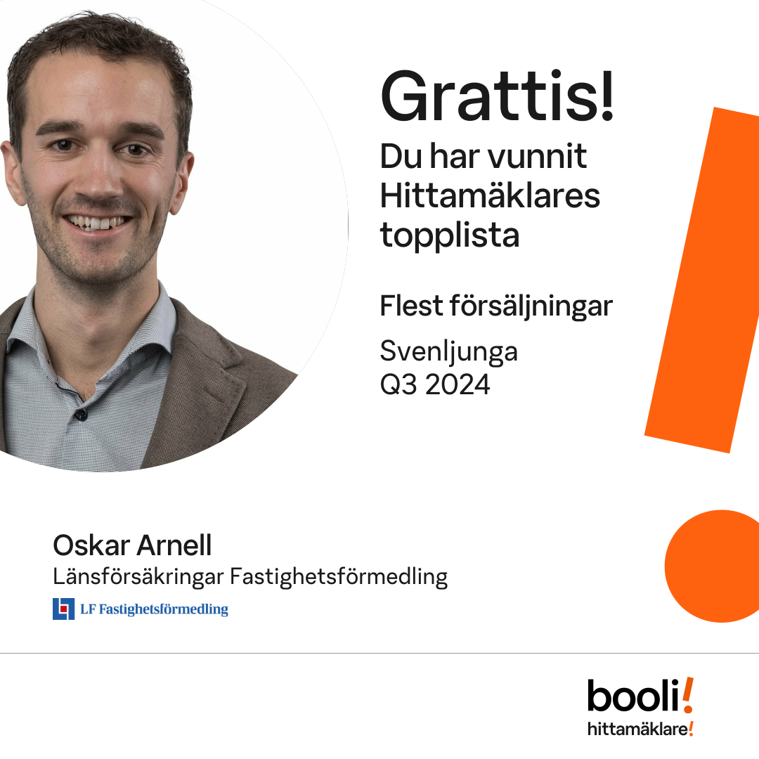 Statistik för publicerade bostäder, försäljningar och omdömen baseras på data från Booli och Hittamäklare. Statistiken för försäljningar avser inrapporterade och verifierade slutpriser från mäklare eller av Booli inhämtade och verifierade slutpriser. Statistiken för publicerade bostäder baseras på information som publicerats på Booli.se. Statistik för omdömen och rekommendationer baseras på omdömen från säljare som lämnats via Booli och Hittamäklare.