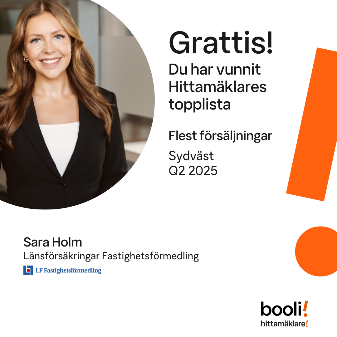 Statistik för publicerade bostäder, försäljningar och omdömen baseras på data från Booli och Hittamäklare. Statistiken för försäljningar avser inrapporterade och verifierade slutpriser från mäklare eller av Booli inhämtade och verifierade slutpriser. Statistiken för publicerade bostäder baseras på information som publicerats på Booli.se. Statistik för omdömen och rekommendationer baseras på omdömen från säljare som lämnats via Booli och Hittamäklare.