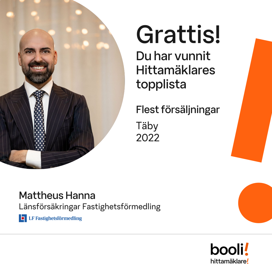 Statistik för publicerade bostäder, försäljningar och omdömen baseras på data från Booli. Statistiken för försäljningar avser inrapporterade och verifierade slutpriser från mäklare eller av Booli inhämtade och verifierade slutpriser. Statistiken för publicerade bostäder baseras på information som publicerats på Booli.se. Statistik för omdömen och rekommendationer baseras på omdömen från säljare som lämnats via Booli.