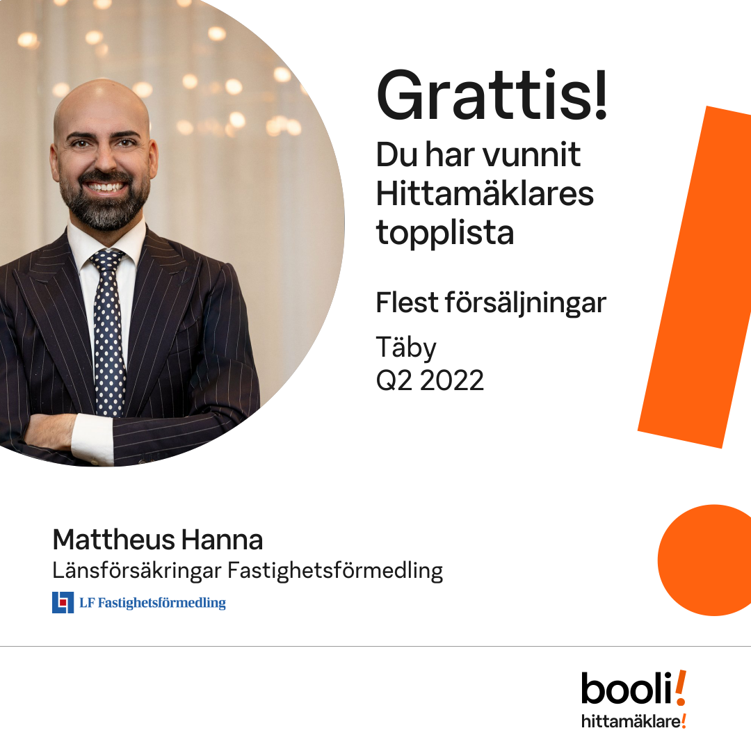 Statistik för publicerade bostäder, försäljningar och omdömen baseras på data från Booli och Hittamäklare. Statistiken för försäljningar avser inrapporterade och verifierade slutpriser från mäklare eller av Booli inhämtade och verifierade slutpriser. Statistiken för publicerade bostäder baseras på information som publicerats på Booli.se. Statistik för omdömen och rekommendationer baseras på omdömen från säljare som lämnats via Booli och Hittamäklare.