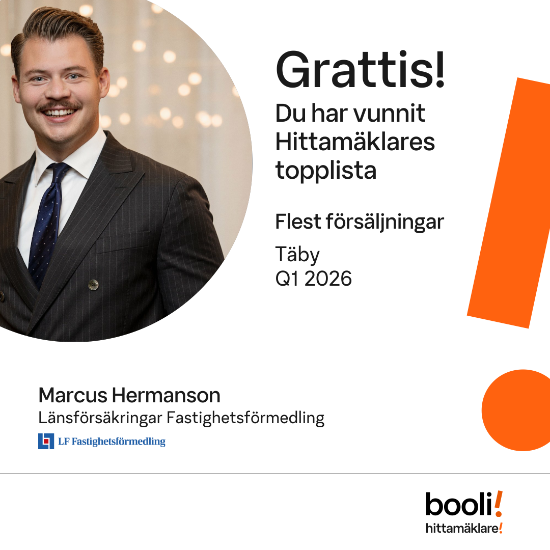 Statistik för publicerade bostäder, försäljningar och omdömen baseras på data från Booli. Statistiken för försäljningar avser inrapporterade och verifierade slutpriser från mäklare eller av Booli inhämtade och verifierade slutpriser. Statistiken för publicerade bostäder baseras på information som publicerats på Booli.se. Statistik för omdömen och rekommendationer baseras på omdömen från säljare som lämnats via Booli.