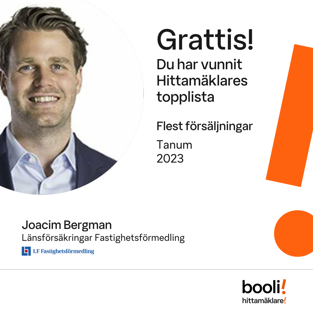 Statistik för publicerade bostäder, försäljningar och omdömen baseras på data från Booli och Hittamäklare. Statistiken för försäljningar avser inrapporterade och verifierade slutpriser från mäklare eller av Booli inhämtade och verifierade slutpriser. Statistiken för publicerade bostäder baseras på information som publicerats på Booli.se. Statistik för omdömen och rekommendationer baseras på omdömen från säljare som lämnats via Booli och Hittamäklare.