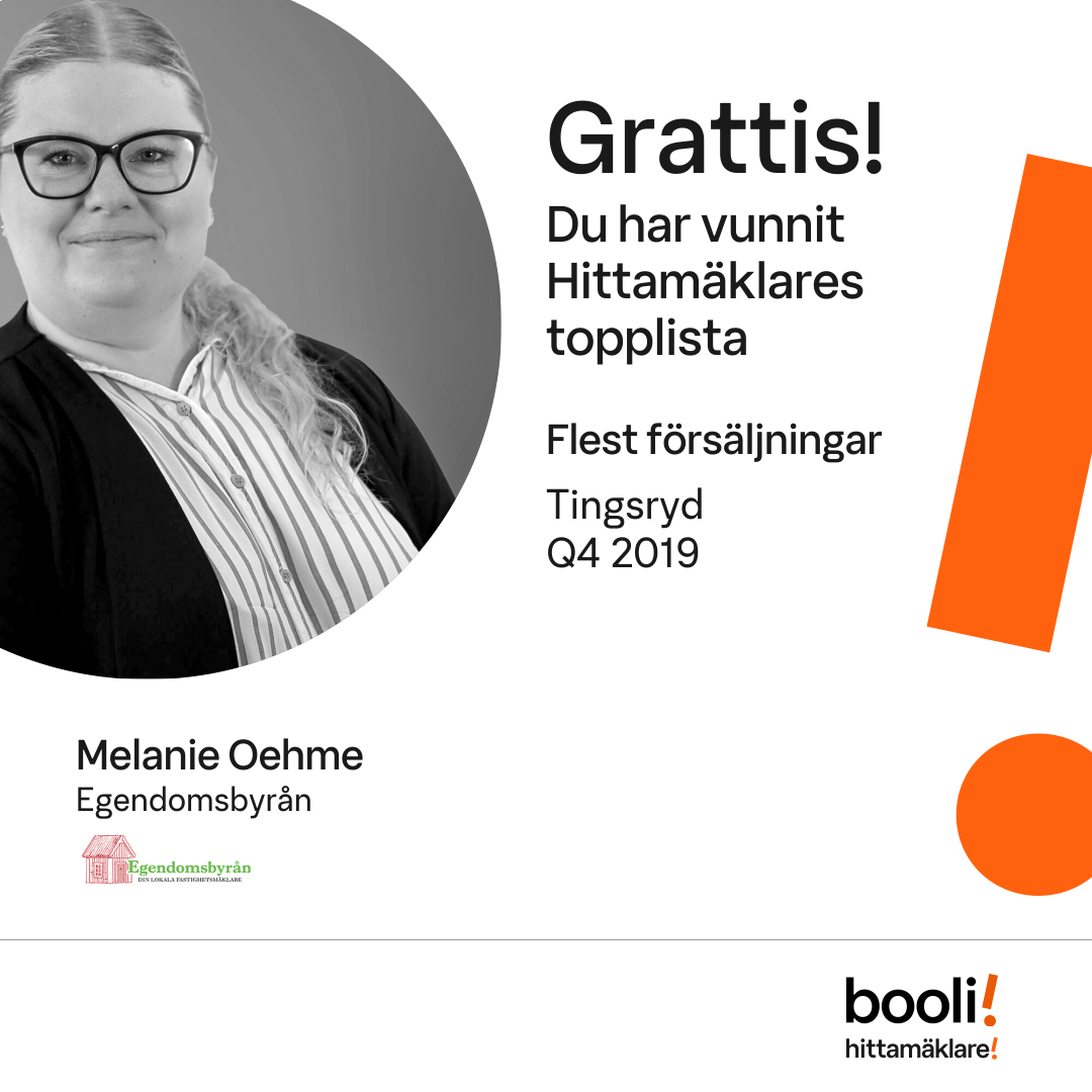 Statistik för publicerade bostäder, försäljningar och omdömen baseras på data från Booli och Hittamäklare. Statistiken för försäljningar avser inrapporterade och verifierade slutpriser från mäklare eller av Booli inhämtade och verifierade slutpriser. Statistiken för publicerade bostäder baseras på information som publicerats på Booli.se. Statistik för omdömen och rekommendationer baseras på omdömen från säljare som lämnats via Booli och Hittamäklare.