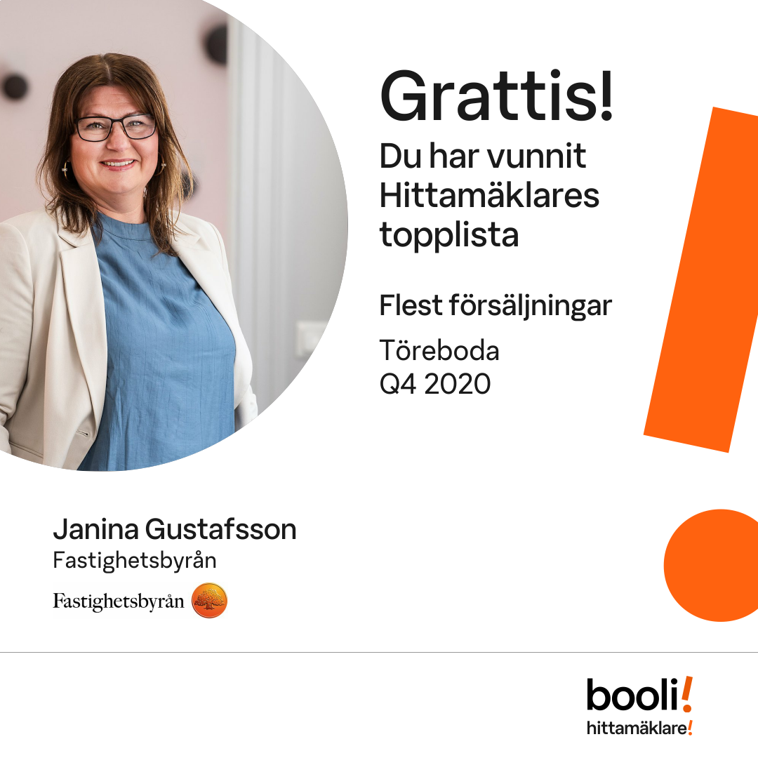 Statistik för publicerade bostäder, försäljningar och omdömen baseras på data från Booli och Hittamäklare. Statistiken för försäljningar avser inrapporterade och verifierade slutpriser från mäklare eller av Booli inhämtade och verifierade slutpriser. Statistiken för publicerade bostäder baseras på information som publicerats på Booli.se. Statistik för omdömen och rekommendationer baseras på omdömen från säljare som lämnats via Booli och Hittamäklare.