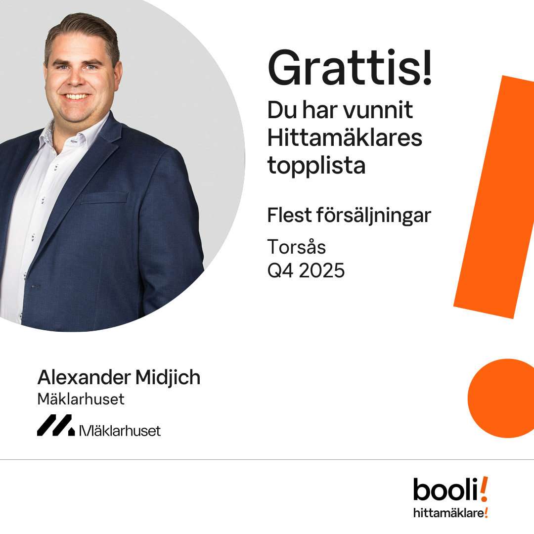 Statistik för publicerade bostäder, försäljningar och omdömen baseras på data från Booli och Hittamäklare. Statistiken för försäljningar avser inrapporterade och verifierade slutpriser från mäklare eller av Booli inhämtade och verifierade slutpriser. Statistiken för publicerade bostäder baseras på information som publicerats på Booli.se. Statistik för omdömen och rekommendationer baseras på omdömen från säljare som lämnats via Booli och Hittamäklare.