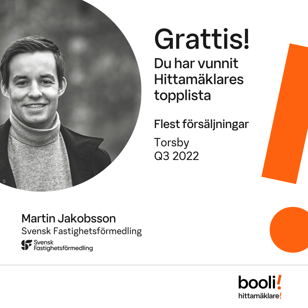 Statistik för publicerade bostäder, försäljningar och omdömen baseras på data från Booli och Hittamäklare. Statistiken för försäljningar avser inrapporterade och verifierade slutpriser från mäklare eller av Booli inhämtade och verifierade slutpriser. Statistiken för publicerade bostäder baseras på information som publicerats på Booli.se. Statistik för omdömen och rekommendationer baseras på omdömen från säljare som lämnats via Booli och Hittamäklare.