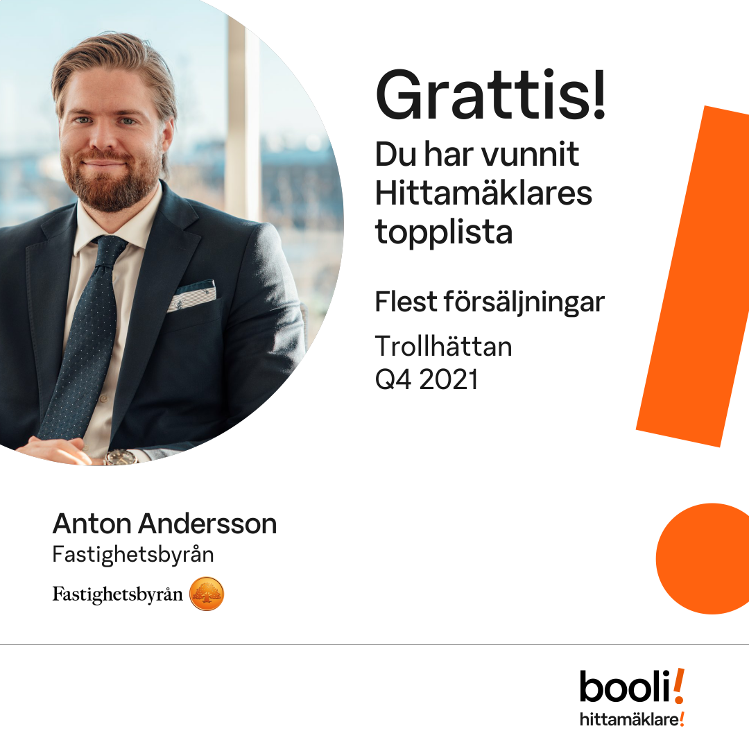Statistik för publicerade bostäder, försäljningar och omdömen baseras på data från Booli och Hittamäklare. Statistiken för försäljningar avser inrapporterade och verifierade slutpriser från mäklare eller av Booli inhämtade och verifierade slutpriser. Statistiken för publicerade bostäder baseras på information som publicerats på Booli.se. Statistik för omdömen och rekommendationer baseras på omdömen från säljare som lämnats via Booli och Hittamäklare.