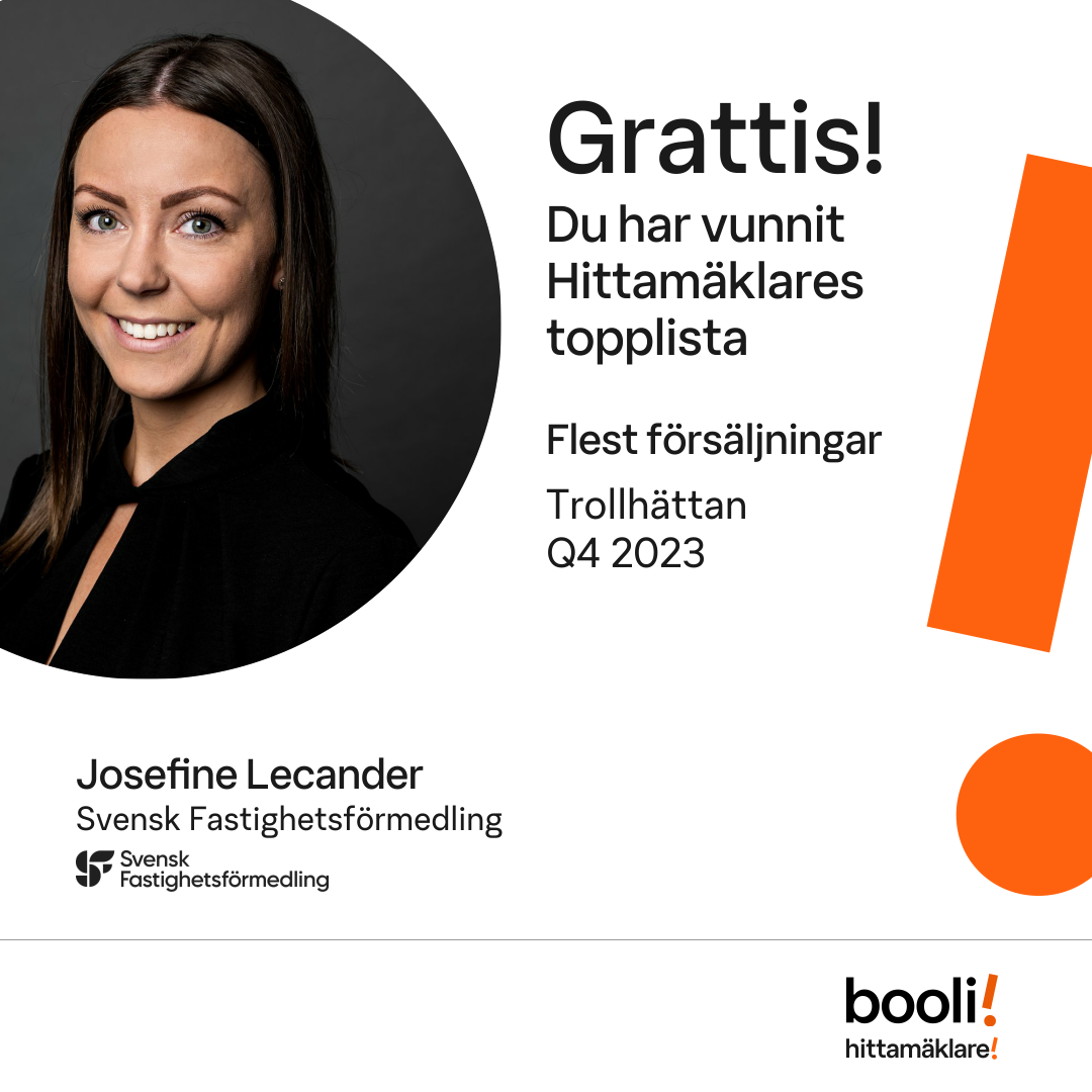 Statistik för publicerade bostäder, försäljningar och omdömen baseras på data från Booli och Hittamäklare. Statistiken för försäljningar avser inrapporterade och verifierade slutpriser från mäklare eller av Booli inhämtade och verifierade slutpriser. Statistiken för publicerade bostäder baseras på information som publicerats på Booli.se. Statistik för omdömen och rekommendationer baseras på omdömen från säljare som lämnats via Booli och Hittamäklare.
