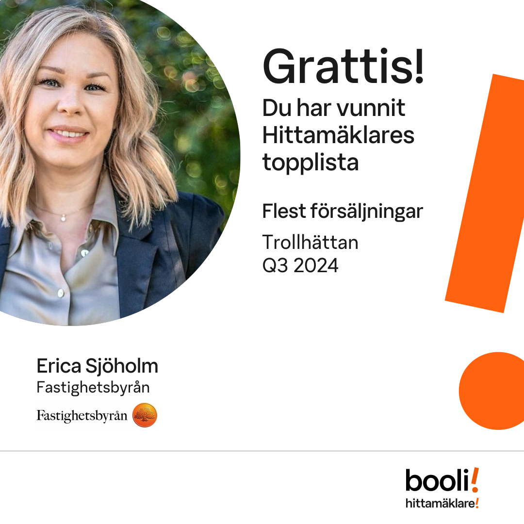 Statistik för publicerade bostäder, försäljningar och omdömen baseras på data från Booli och Hittamäklare. Statistiken för försäljningar avser inrapporterade och verifierade slutpriser från mäklare eller av Booli inhämtade och verifierade slutpriser. Statistiken för publicerade bostäder baseras på information som publicerats på Booli.se. Statistik för omdömen och rekommendationer baseras på omdömen från säljare som lämnats via Booli och Hittamäklare.