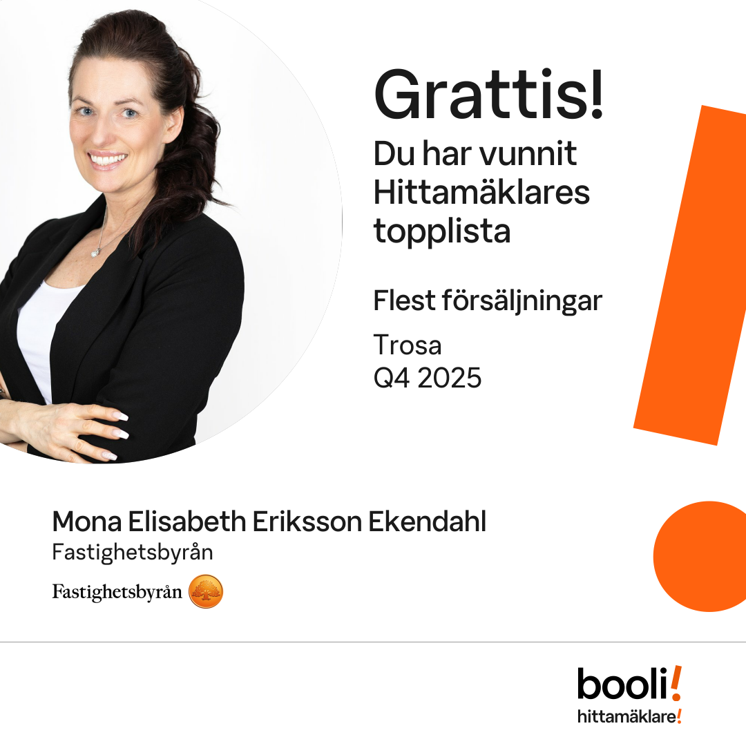 Statistik för publicerade bostäder, försäljningar och omdömen baseras på data från Booli och Hittamäklare. Statistiken för försäljningar avser inrapporterade och verifierade slutpriser från mäklare eller av Booli inhämtade och verifierade slutpriser. Statistiken för publicerade bostäder baseras på information som publicerats på Booli.se. Statistik för omdömen och rekommendationer baseras på omdömen från säljare som lämnats via Booli och Hittamäklare.