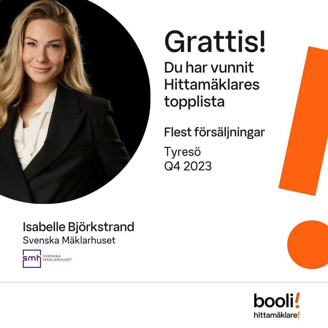 Statistik för publicerade bostäder, försäljningar och omdömen baseras på data från Booli och Hittamäklare. Statistiken för försäljningar avser inrapporterade och verifierade slutpriser från mäklare eller av Booli inhämtade och verifierade slutpriser. Statistiken för publicerade bostäder baseras på information som publicerats på Booli.se. Statistik för omdömen och rekommendationer baseras på omdömen från säljare som lämnats via Booli och Hittamäklare.