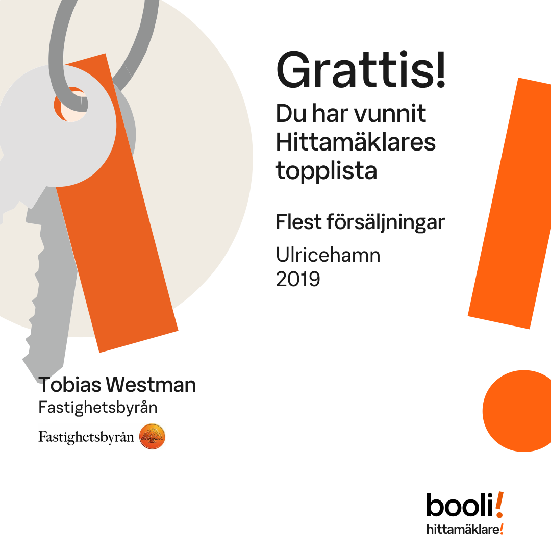 Statistik för publicerade bostäder, försäljningar och omdömen baseras på data från Booli och Hittamäklare. Statistiken för försäljningar avser inrapporterade och verifierade slutpriser från mäklare eller av Booli inhämtade och verifierade slutpriser. Statistiken för publicerade bostäder baseras på information som publicerats på Booli.se. Statistik för omdömen och rekommendationer baseras på omdömen från säljare som lämnats via Booli och Hittamäklare.