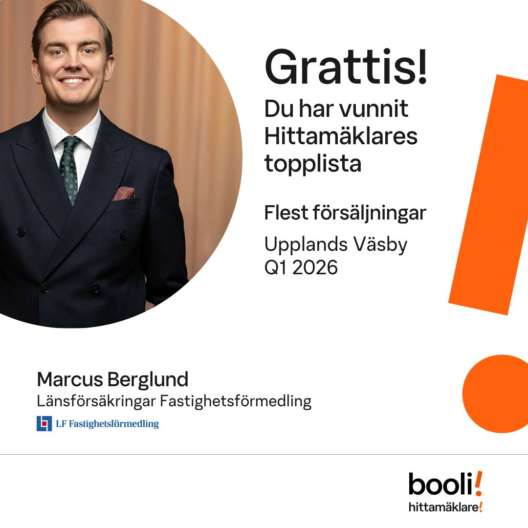 Statistik för publicerade bostäder, försäljningar och omdömen baseras på data från Booli. Statistiken för försäljningar avser inrapporterade och verifierade slutpriser från mäklare eller av Booli inhämtade och verifierade slutpriser. Statistiken för publicerade bostäder baseras på information som publicerats på Booli.se. Statistik för omdömen och rekommendationer baseras på omdömen från säljare som lämnats via Booli.