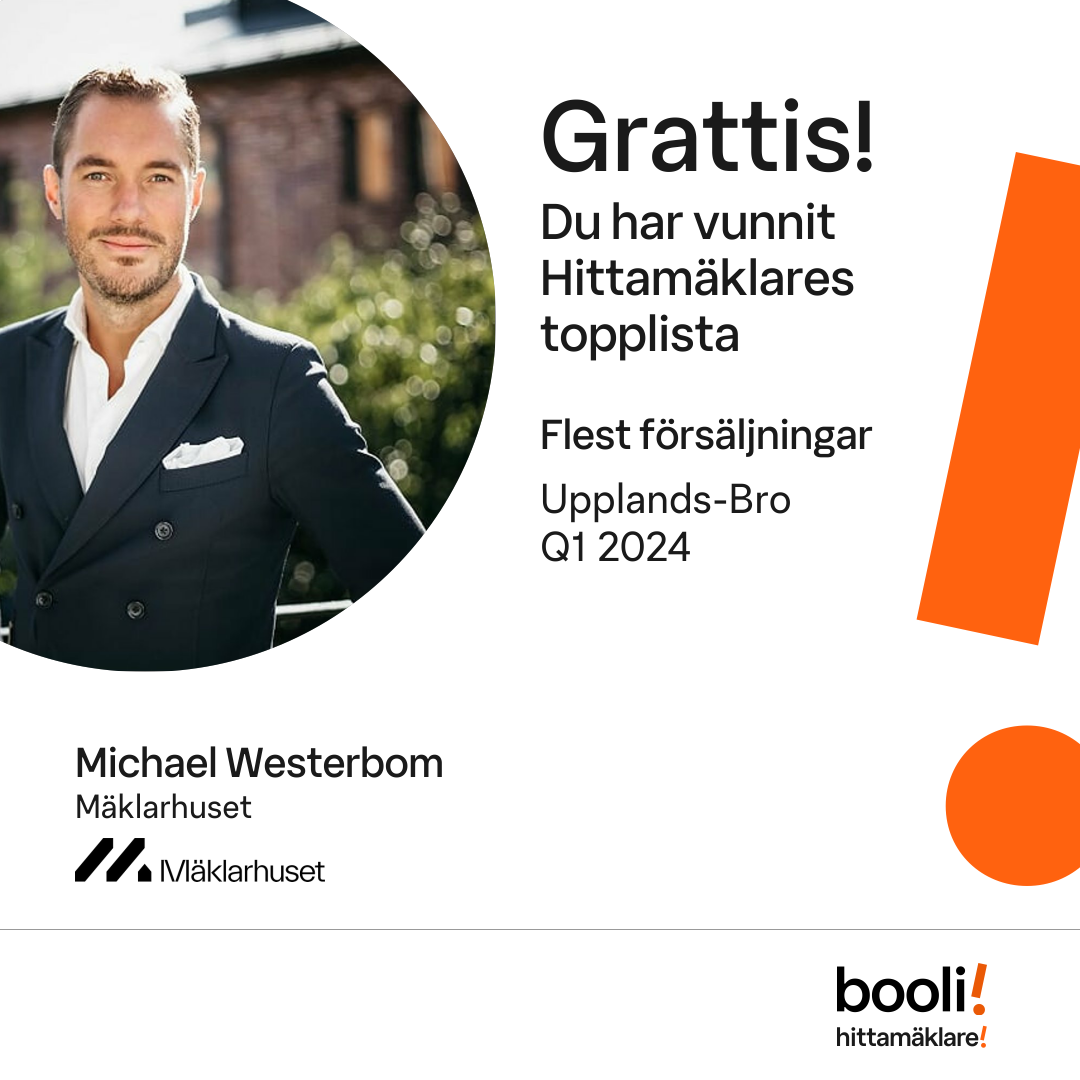Statistik för publicerade bostäder, försäljningar och omdömen baseras på data från Booli och Hittamäklare. Statistiken för försäljningar avser inrapporterade och verifierade slutpriser från mäklare eller av Booli inhämtade och verifierade slutpriser. Statistiken för publicerade bostäder baseras på information som publicerats på Booli.se. Statistik för omdömen och rekommendationer baseras på omdömen från säljare som lämnats via Booli och Hittamäklare.